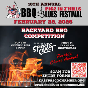 The 16th Annual Pigz in Z'Hills BBQ & Blues Festival is the Greater East Pasco Chamber of Commerce signature event. As the name suggests, BBQ & Blues features a friendly Kidz Grillin' competition amidst a background of the blues music, hog calling contest, and a wing eating contest!